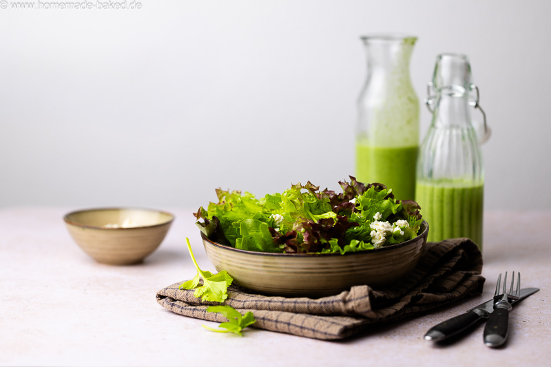 - Ggf. nochmal mit Salz und Pfeffer abschmecken und sollte das Dressing zu dickflüssig sein, noch etwas Buttermilch oder Wasser untermixen.